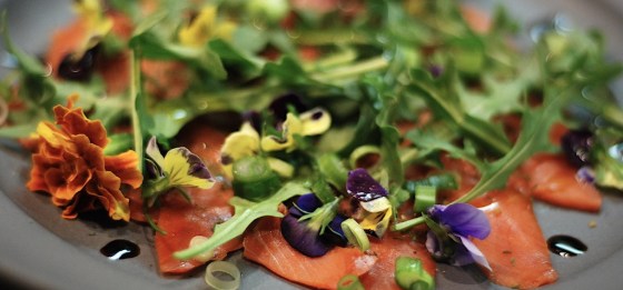 I recently learned about Ecopia Farms, a farm in Campbell, CA that grows and delivers artisan lettuces, petite herbs and microgreens, edible flowers and other speciality items. This evening, I used their flowers to accent a smoked salmon salad. I simply topped the salmon slices with arugula, drizzled with extra-virgin olive oil and balsamic vinegar, sprinkled with Maldon sea salt, and garnished with flowers.